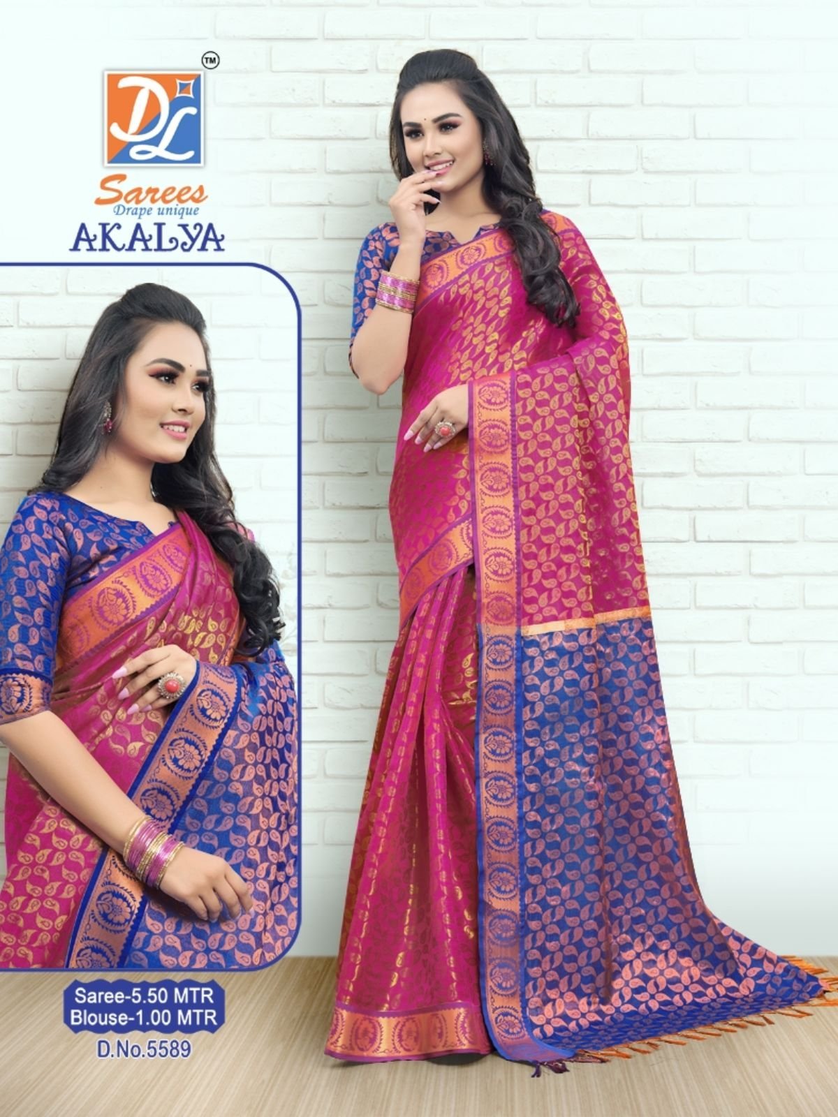 ”Akalya” a Special Copper Tissue warp with fine art silk weft jaquard woven Saree accompany with contrast color jaquard pallu and blouse. Saree has 3 inch Small Border on both side with attractive Foral design throughout the saree.